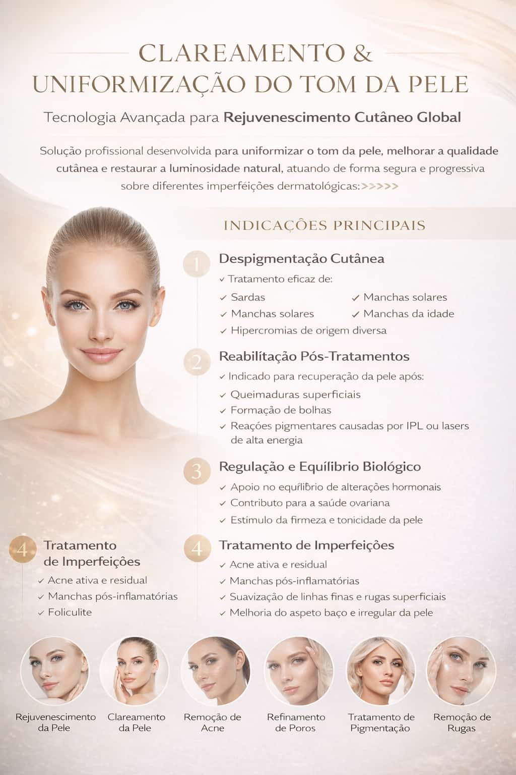 Promoção de uma pele mais luminosa, uniforme e radiante.