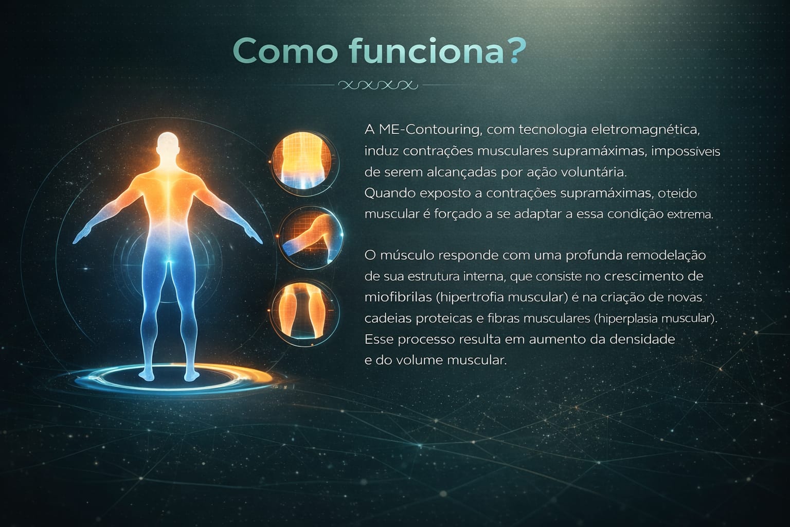 Durante cada sessão, o equipamento induz contrações musculares supramáximas (mais intensas do que as que conseguimos no treino físico tradicional), promovendo o crescimento muscular e a eliminação de gordura de forma simultânea.